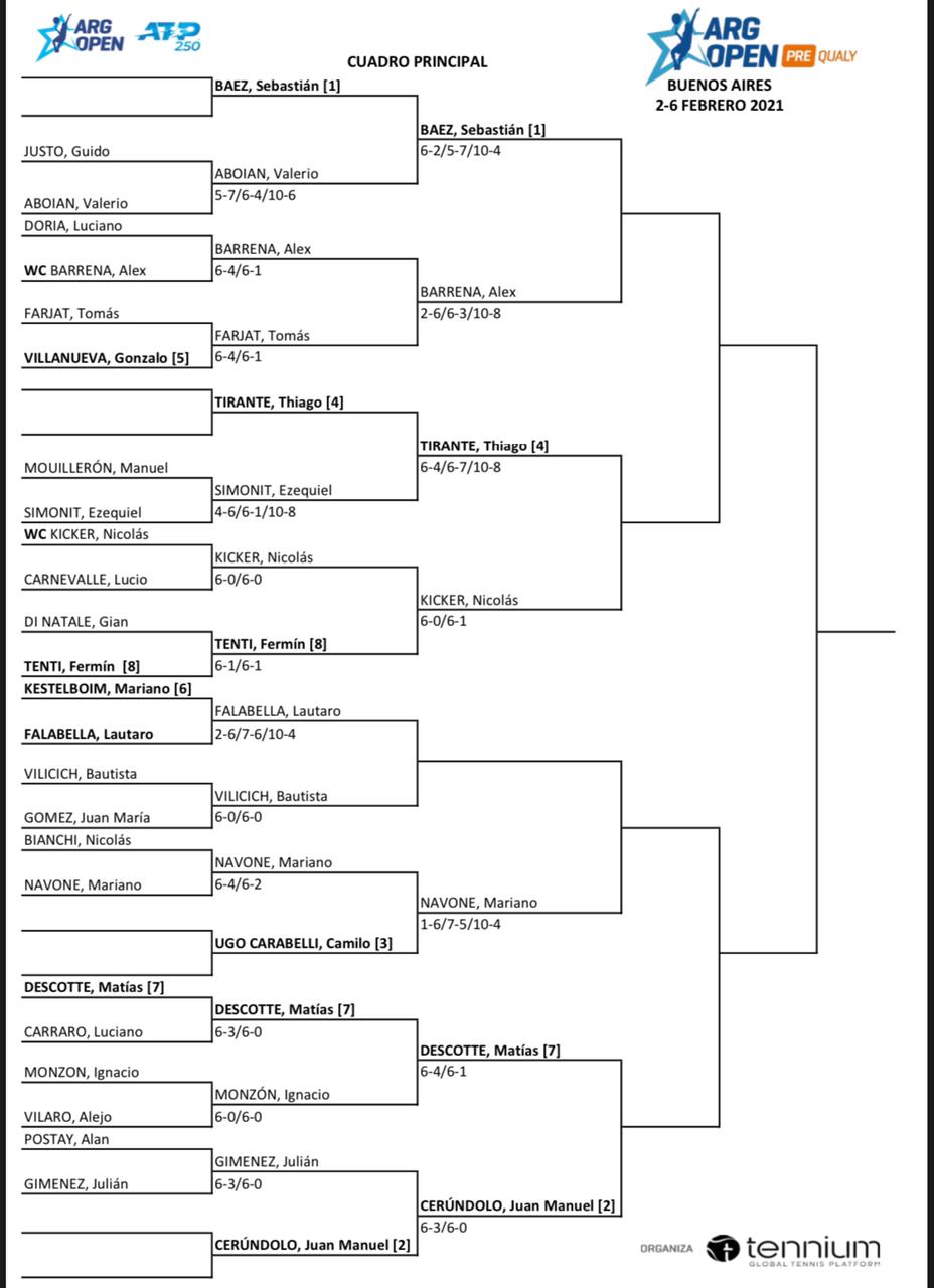 También por el lado alto del cuadro, Sebastián Baez, máximo favorito, debutó hoy con un triunfo ante Valerio Aboian por 6-2, 5-7 (10-4), y mañana se medirá con Alex Barrena, que derrotó a Tomás Farjat por 2-6, 6-3 (10-8).